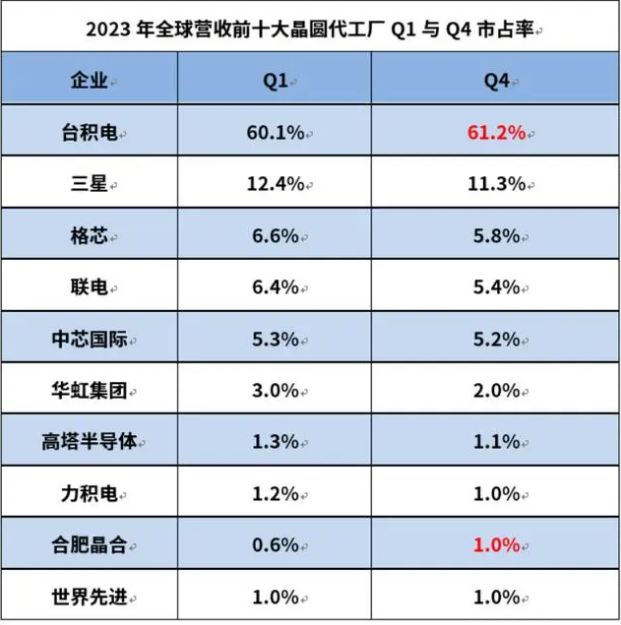 另外,从2023年全年的晶圆代工市占率变化来看,营收前10大晶圆代工厂中,除台积电仍在扩大影响力之外,仅有晶合集成的市占率实现正增长,从第一季度的0.6%增至第四季度的1.0%。未来随着晶合集成的三期投产和新工艺平台量产,这一数字有望继续增长。