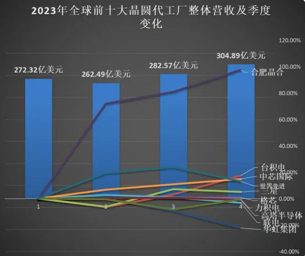 观察2023年全球前十大晶圆厂各季度的营收情况,总营收数据在第二季度触底后开始反弹。如下图所示,若以第一季度为基准,2023年前10中仅有3家公司营收实现逐季攀升,分别是格芯、中芯国际和晶合集成,其中格芯变化幅度较小;晶合集成反弹幅度最大,Q4营收相较Q1实现了97.4%的大幅增长。