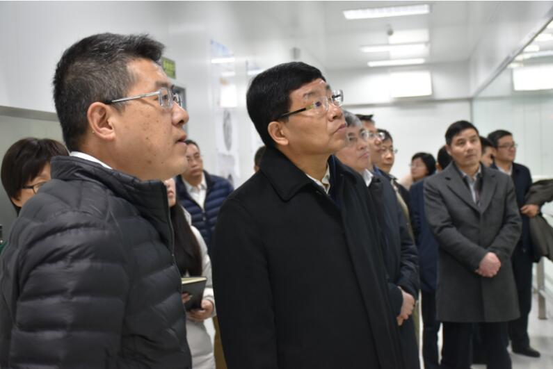 领导一行到研发楼四楼参观生产车间,了解到各种自动化搬运系统和无尘室的配置。黎总着重向何副省长介绍了车间内的软硬件装置,集成电路行业"重投资"全副武装在生产利器。