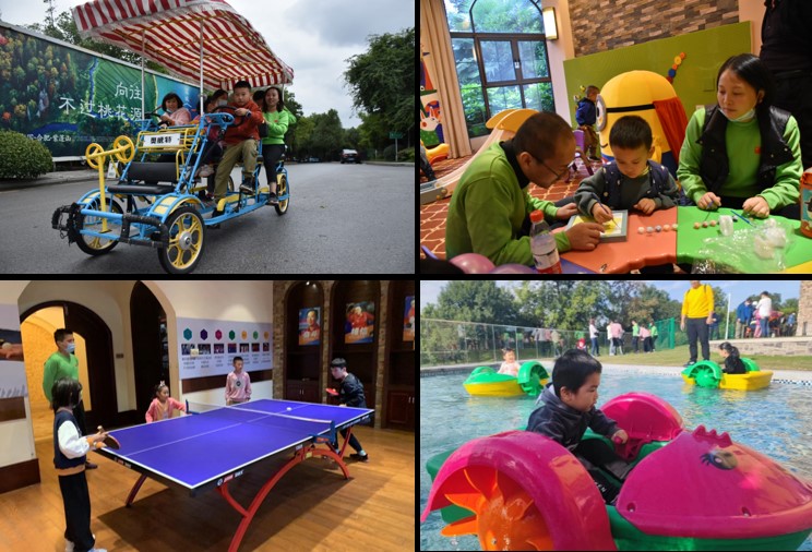 热身游戏后,放松一下吧~骑上自行车,呼吸着清新的空气,欣赏被雨水洗过的满眼翠绿;孩子们拿起画笔描绘出心中的世界;球室里感受乒乓球的魅力;手摇小船,在水面乘风破浪,好不惬意自在……