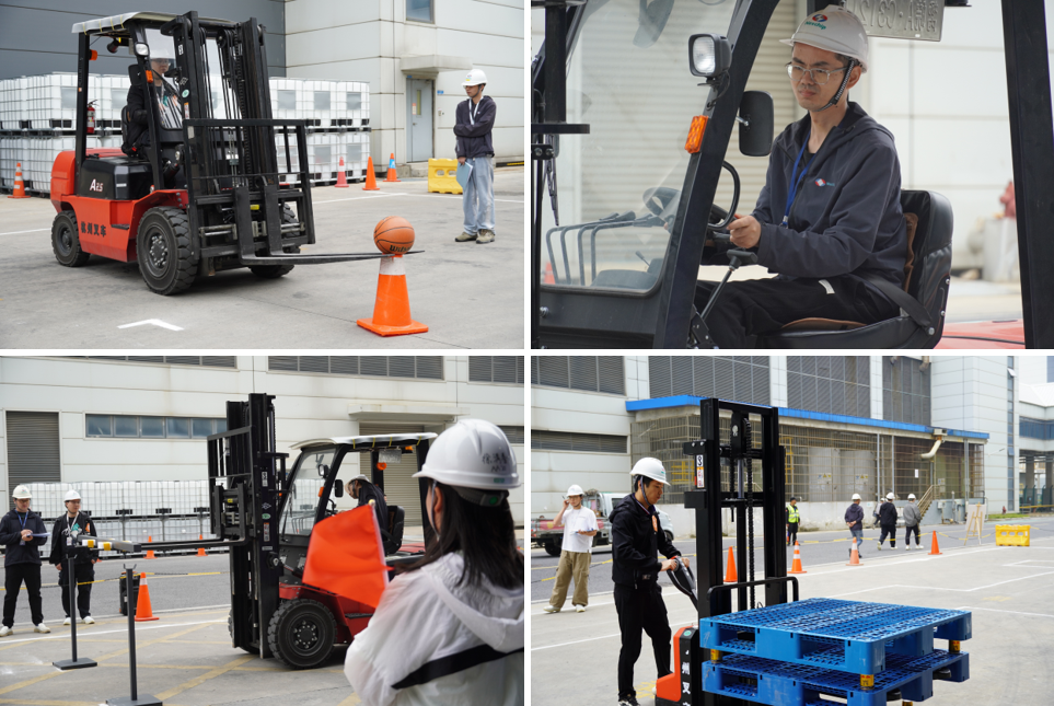 随着一声令下,紧张激烈的比赛拉开帷幕。25支优秀队伍分别进行了个人赛叉车体操、运球高手、堆塔王者以及团体赛五环接力比拼。