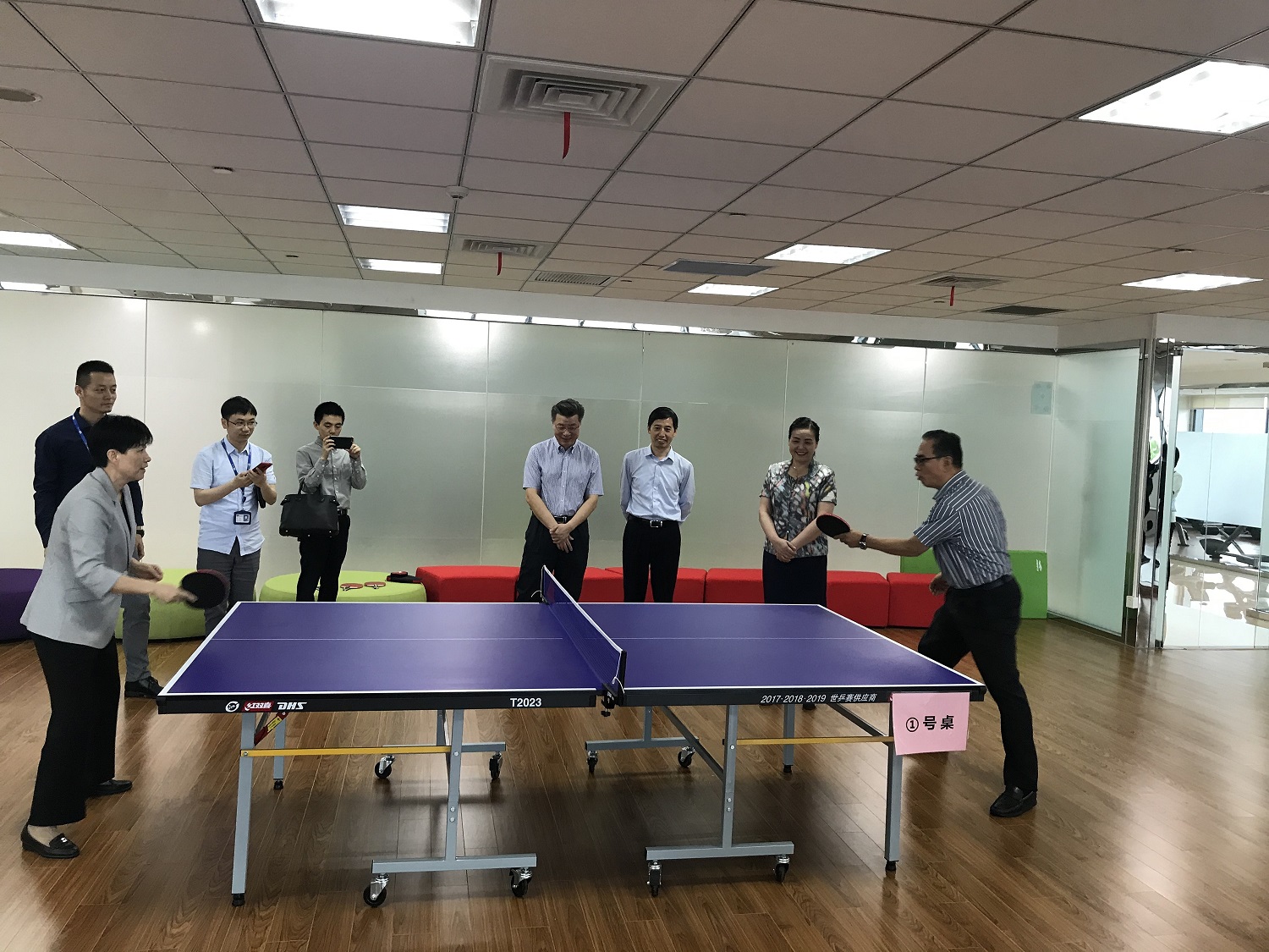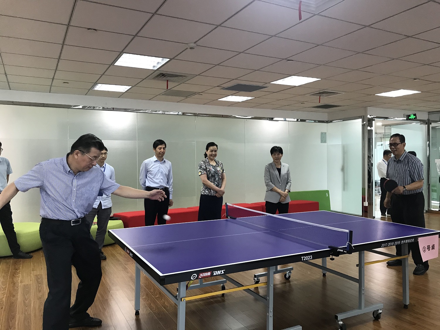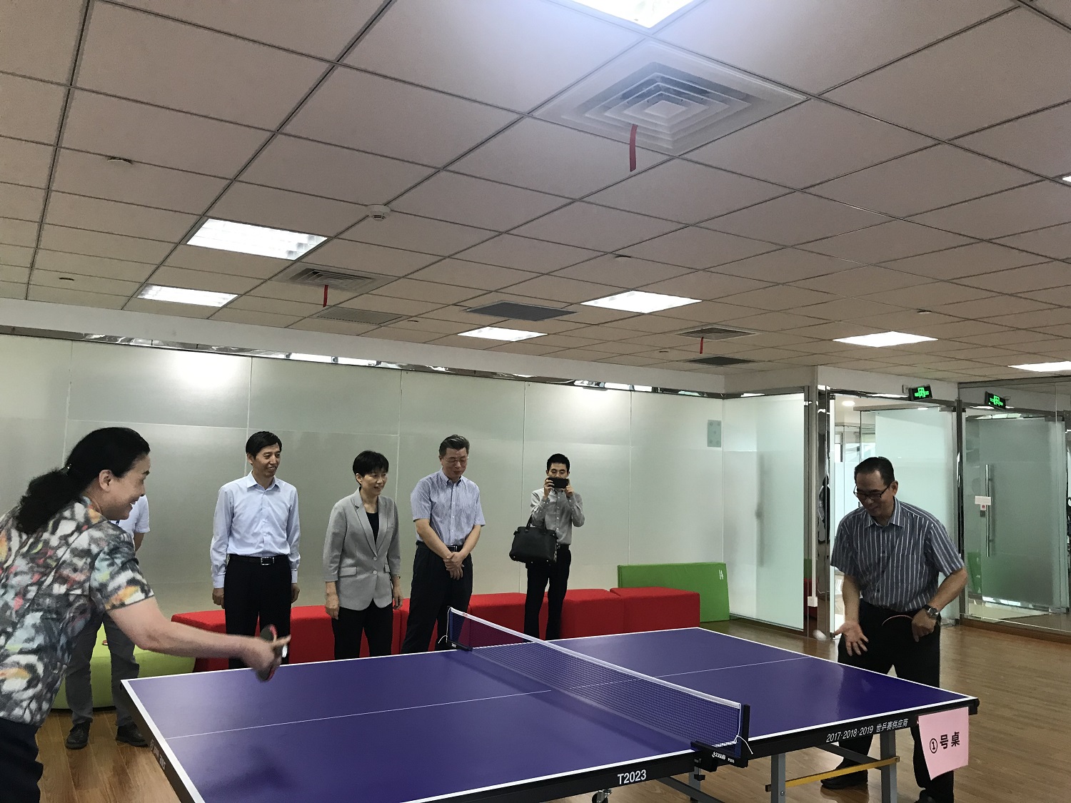 蔡副主席在二楼职工活动中心先后参观了健身房、KTV、瑜伽教室等员工休闲娱乐场所,并与在场的三位领导互动,一展乒乓风采。